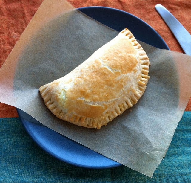 Στη μέση του φύλλου έβαλα μια καλή κουταλιά από τη γέμιση που ετοίμασα. Τι έμεινε? Δίπλωμα και κλεισιμο! Δίπλωσα το υπόλοιπο φύλλο από πάνω και το έκλεισα με τη βοήθεια ενός πηρουνιού. Ετοίμασα και τις υπόλοιπες τυρόπιτες, τις έβαλα σε ένα ελαφρώς λαδωμένο πυρέξ (πάιρεξ το λένε εδώ – έλεος?) και από πάνω τις άλειψα με λίγο αυγό.