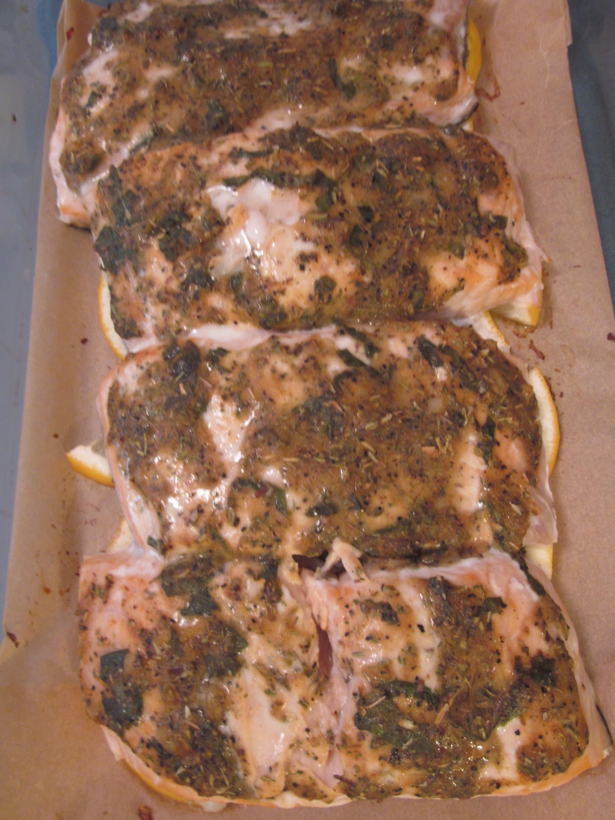 3. Ακουμπάμε πάνω στο μυρωδικό στρώμα που ετοιμάσαμε τους σολωμούς.