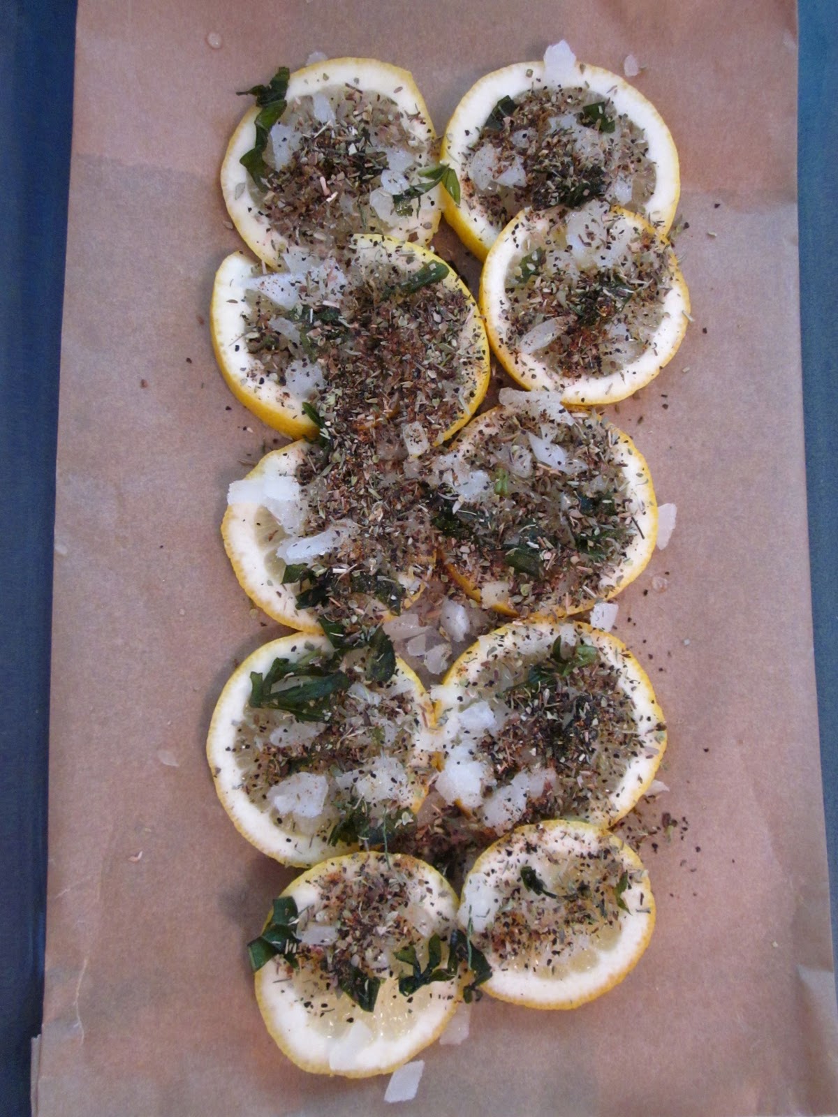 2. Πάνω απ’τα λεμόνια ρίχνουμε ψιλοκομμένο κρεμμυδάκι, και ό,τι αρωματικά θέλουμε: ρίγανη, βασιλικό, θυμάρι κλπ… Όλα αυτά στο ψήσιμο θα αφήσουν τα αρώματά τους…